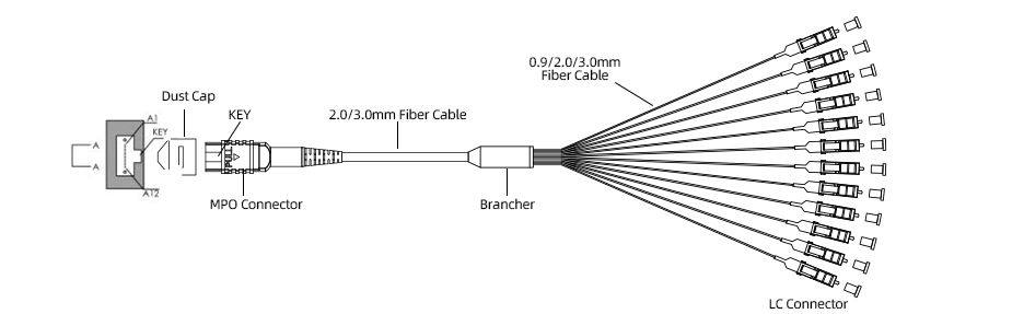 Available in different connector types such as MPO-LC, MPO-SC, MPO-FC, and different transmission modes such as single mode (OS2) and multi-mode (OM3, OM4, OM5), as well as different core counts such as 8-core, 12-core, 16-core, and 24-core.
