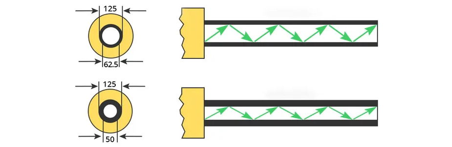 Core Diameter: Multimode fibers have a larger core diameter (usually 50/62.5μm) and can transmit multiple modes of light, while single-mode fibers have a smaller core diameter (usually 9μm) and can only transmit a single mode of light.