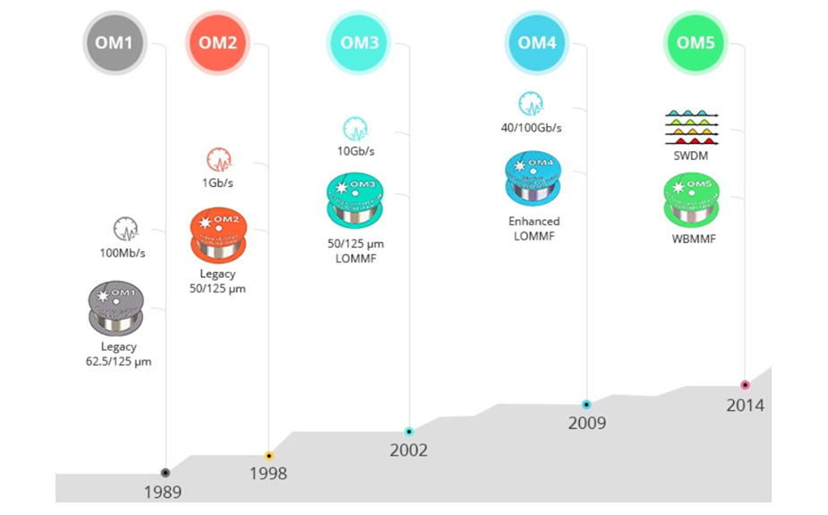 Driven by the demand for high-speed network applications, multimode fibers are evolving towards lower loss, higher bandwidth, and wavelength division multiplexing. With continuous improvements in fiber optic technology, multimode fibers have evolved from the original OM1 fiber to the current OM5 fiber, which supports 40/100G networks with superior performance.