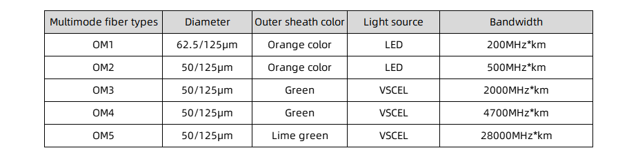 There are differences in the physical characteristics of various multimode fibers, mainly including diameter, outer jacket color, light source, and bandwidth, as shown in the table below: