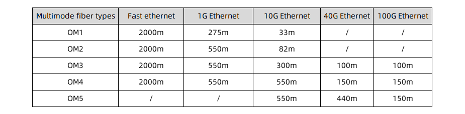 Various multimode fibers support different maximum transmission distances in various Ethernet applications, as shown in the table below: