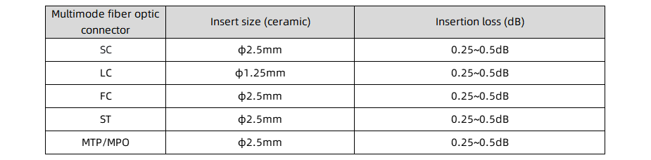 Currently, common multimode fiber connectors (i.e., terminations) include ST, SC, FC, LC, MU, E2000, MTRJ, SMA, DIN, and MTP&MPO, among which ST, SC, FC, LC, and MTP/MPO are the most commonly used fiber connector types. These five types of fiber connectors have different advantages, disadvantages, and functionalities. The table below lists the differences in plug size, insertion loss, and other aspects of ST, SC, FC, LC, and MTP/MPO connectors for multimode fibers: