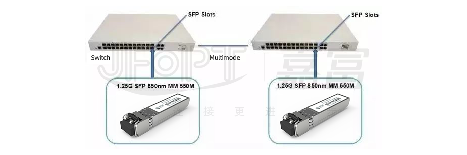 When using SFP modules, there is an important principle to follow: all SFP modules must be used in pairs. For common SFP modules, the key to the connection is to ensure that the SFPs at both ends have the same wavelength. For example, if we use an 850nm SFP on one end, then on the other end, we must also use an 850nm SFP to ensure smooth signal transmission (as shown in the diagram).