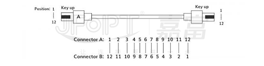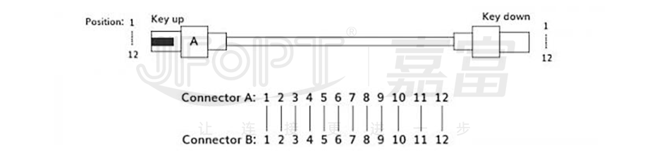 2) Type B (Cross-over): MPO Patch Cord are ingeniously designed. The arrangement of fiber cores at both ends of this type of jumper presents a reverse pattern, where the first fiber core at one end corresponds to the twelfth fiber core at the other end, and vice versa. In terms of Key orientation, the direction of both ends is consistent, meaning Key up corresponds to Key up, and Key down corresponds to Key down.