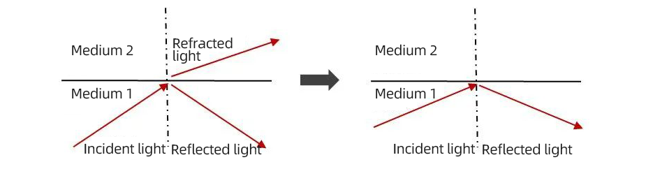 When light transitions from one medium to another, refraction and reflection occur at the interface between the two media. As the angle of incidence, the angle between the light ray and the interface, increases, the reflected light gradually intensifies, while the refracted light diminishes. When the angle of incidence reaches a certain critical value, the refracted light completely vanishes, leaving only the reflected light. This phenomenon is known as total internal reflection.