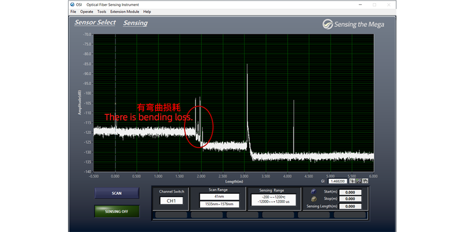 To more accurately locate and reduce bending loss, we can use Optical Frequency Domain Reflectometry (OFDR) equipment to measure the fiber link. OFDR can generate a distribution curve (distance vs. intensity/reflectance), which clearly reflects the loss situation at various points along the fiber link. Loss typically appears as steps on the curve, allowing us to intuitively identify and adjust the positions where loss occurs.
