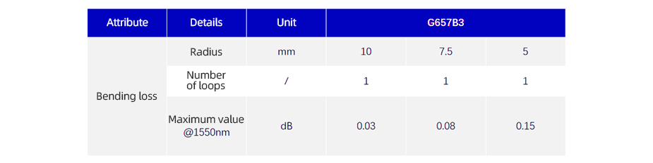 Through these methods, we can effectively mitigate the impact of fiber bending in sensing measurements, ensuring that the light signal can still be transmitted stably and efficiently in bent fibers. One commonly used type of bend-insensitive fiber on the market is G.657B3. The specific parameters for its bending radius and bending loss are shown in the table, which you can refer to when selecting fibers.