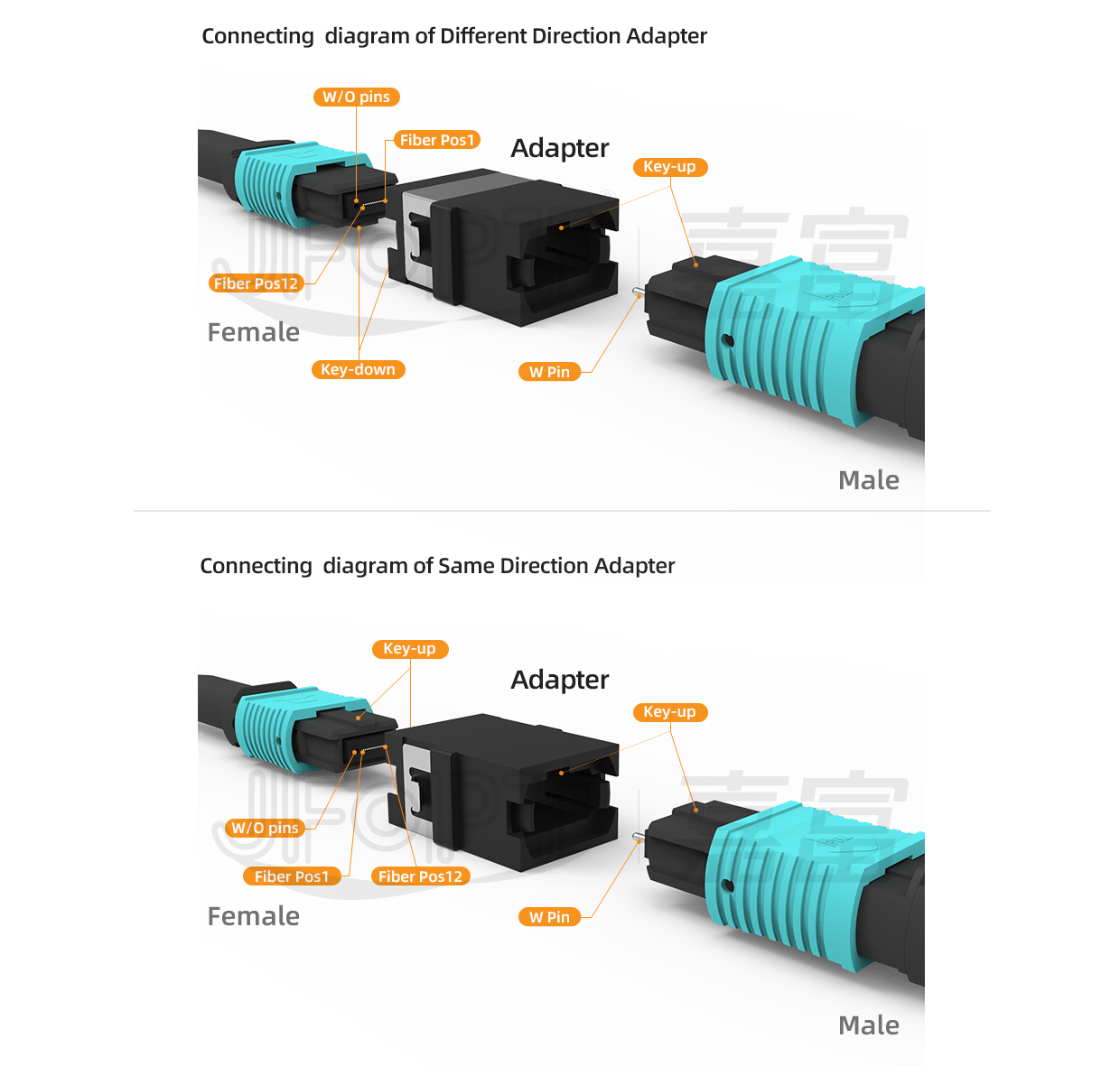 The MPO adapter is used for the connecting and fixing between MPO connectors. After its key groove fits with key of MPO connector, and the guide pins of male MPO connector is aligned with the holes of female MPO connector, MPO adapter will lock them inside to ensure their stable performance.