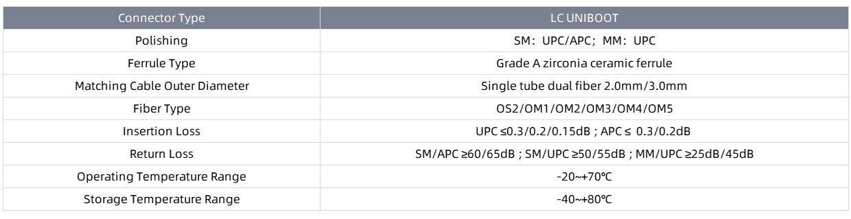 The LC UNIBOOT connector can be used in a high-density assembly environment. Compared with the traditional duplex connector, this product uses a dual cores cable in one tube, which greatly reduces the wiring size, effectively improving ventilation in a high-density crowded environment.