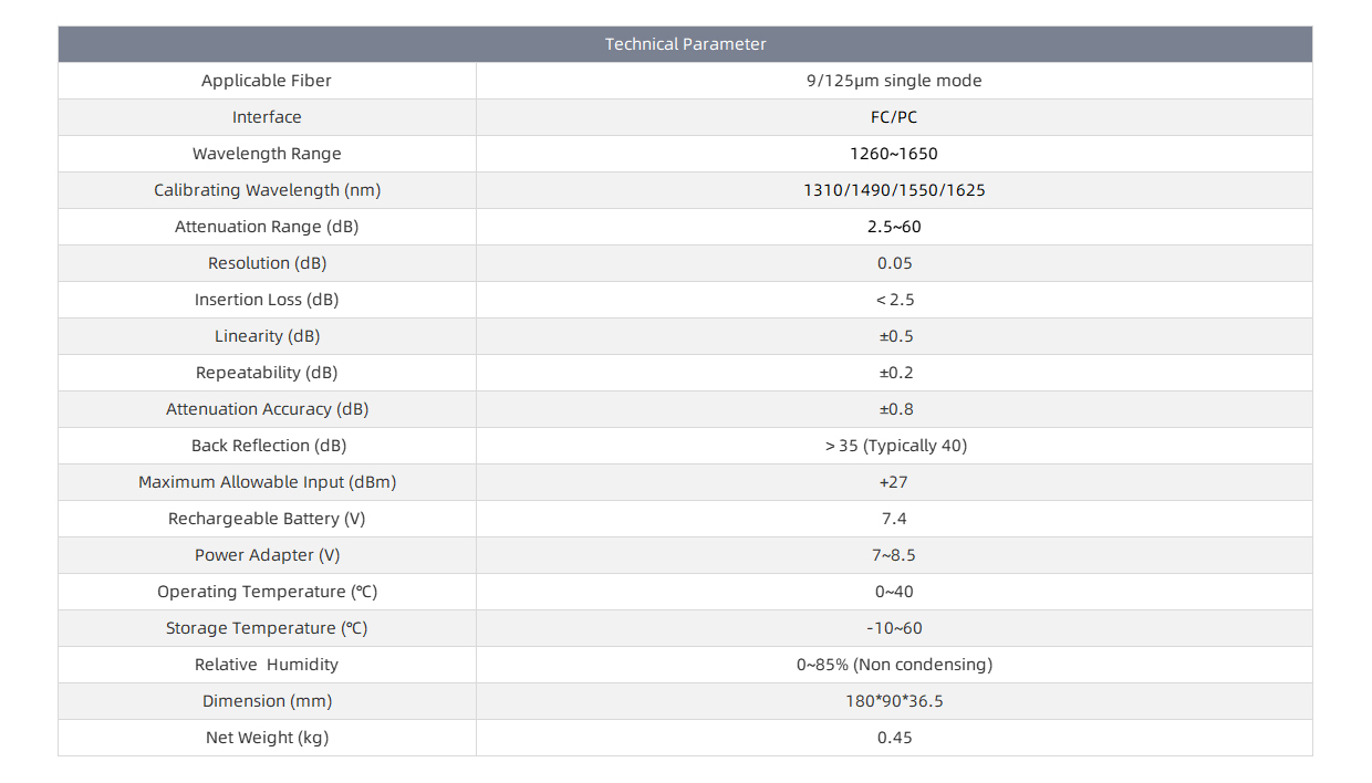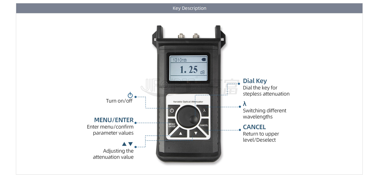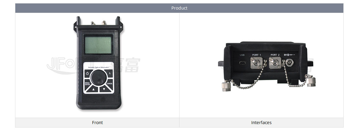 JFOAT-HVA01 Handheld Variable Optical Attenuator is an optical test instrument for the test and measurement of optical fiber system and signal attenuation of short distance communication. It can continuously and variably attenuate optical signals and is widely used in digital and analog modulation systems of communication equipment.