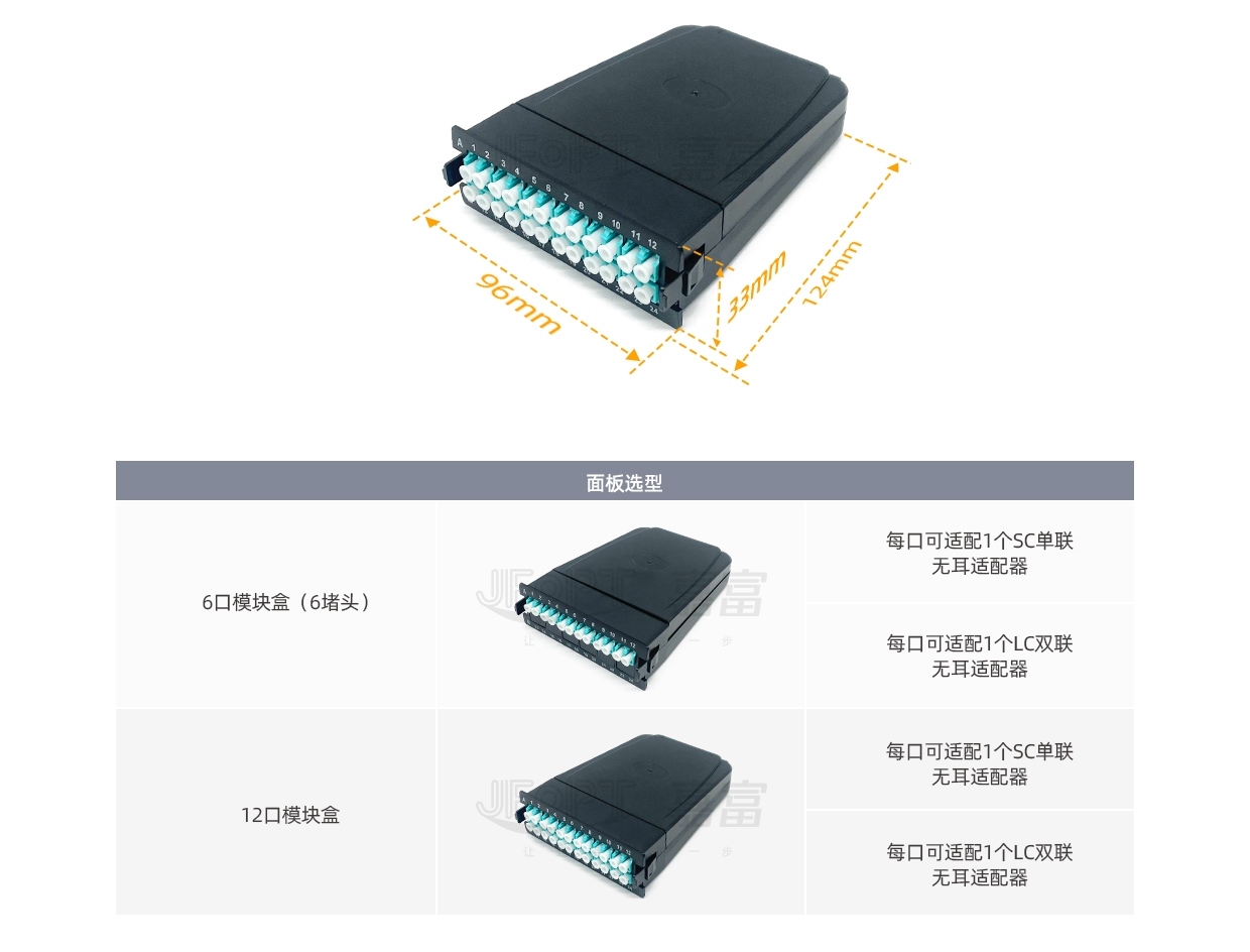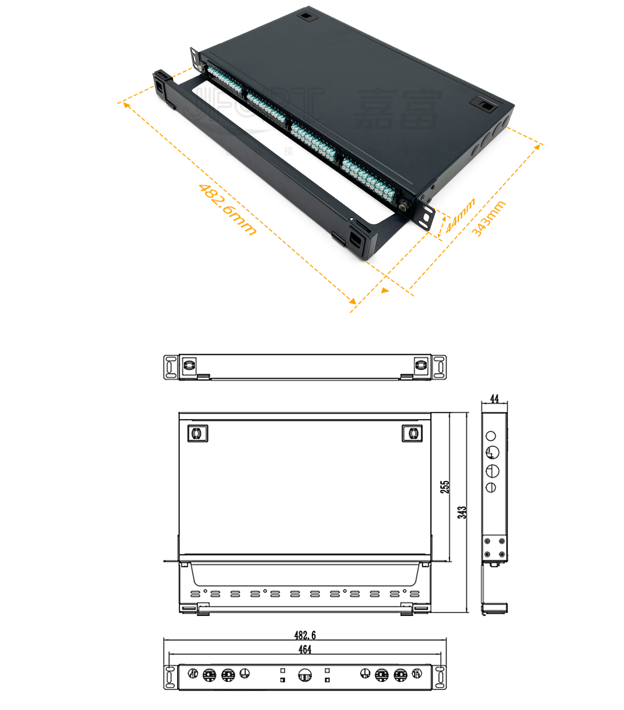 JFOPP-RMP/MPO10-A-007F Fixed MPO/MTP HD enclosure adopts modular design and is equipped with quick-opening upper cover for easy construction and operation. The enclosure is equipped with a front cable tray, which is fully equipped with a maximum of 94 cores, and can be configured with 12 cores or 24 cores Cassettes.It is mainly used in high-density fiber cabling systems, fast cabling systems, backbone networks, highly integrated devices and devices, data centers, SAN systems, etc.