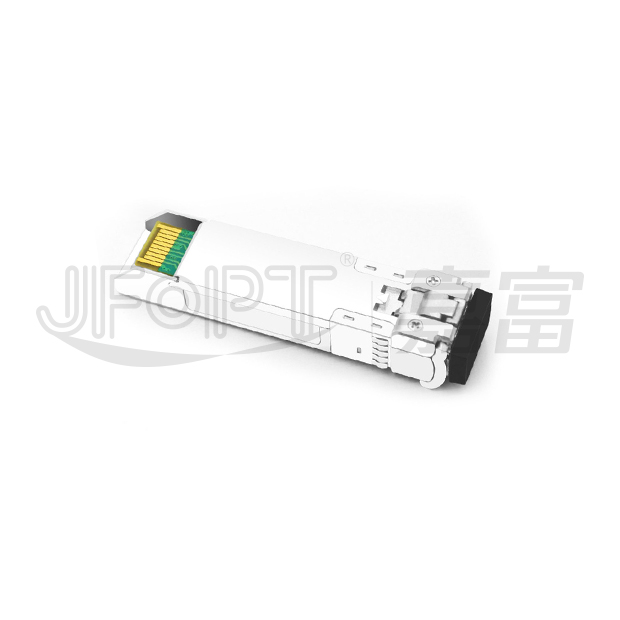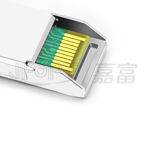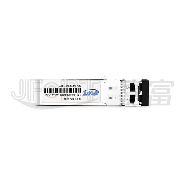 The JFOPT SFP+ 8.5G 850nm 300m SR LC DX multi-mode transceiver is a compact, pluggable module designed for serial optical data communication applications such as X1/X2/X4/X8 Fiber Channel. Equipped with a 20-pin SFP+ connector, it supports hot-plugging capabilities. Digital diagnostics are accessible via an I2C interface. This module is optimized for multimode fiber, operating at a nominal wavelength of 850nm. Its transmitter utilizes a Vertical Cavity Surface Emitting Laser (VCSEL), compliant with Class 1 laser safety standards per IEC 60825. The receiver section features an integrated GaAs detector preamplifier (IDP) within an optical header, along with a limiting post-amplifier IC for enhanced signal processing.