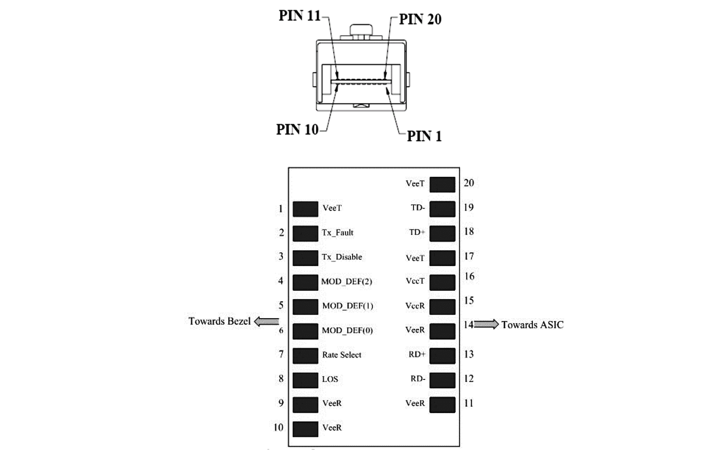 3) Mod-Def 0,1,2. These are the module definition pins. They should be pulled up with a 4.7K – 10K resistor on the host board. The pull-up voltageshall be VccT or VccR .