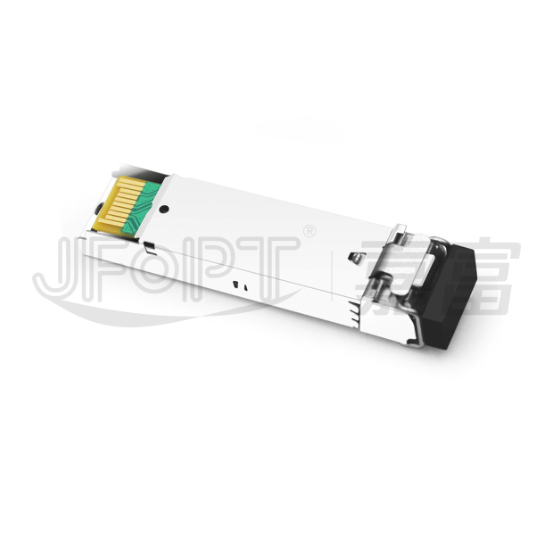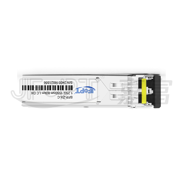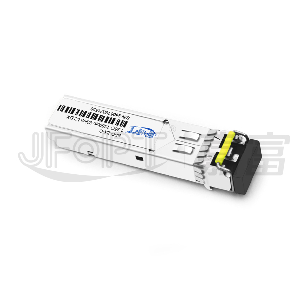 The JFOPT SFP 1.25G 1550nm 40/80/100/120/160km LC DX Transceiver is a compact single-mode module designed for high-speed serial optical data communication, supporting extended transmission distances of 40/80/100/120/160km; this small form-factor pluggable (SFP) module is compatible with Gigabit Ethernet 1000BASE-ZX and Fiber Channel 1x SM-LC-L FC-PI standards, featuring a 20-pin connector enabling hot-plug capability for seamless integration and maintenance. Optimized for single-mode fiber operation at 1550nm wavelength, its transmitter integrates a high-performance multiple quantum well (MQW) 1550nm DFB laser compliant with IEC-60825 Class 1 laser safety standards, while the receiver incorporates an advanced optical detection system with integrated InGaAs detector preamplifier (IDP) mounted in an optical header and precision limiting post-amplifier IC to ensure reliable signal reception and processing; the entire series adheres to the SFF-8472 SFP Multi-Source Agreement (MSA), guaranteeing industry-standard compatibility and interoperability.