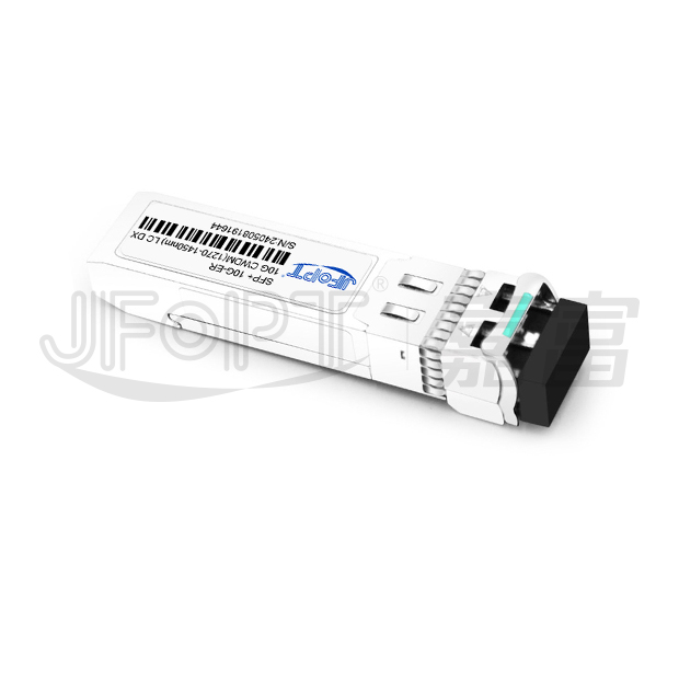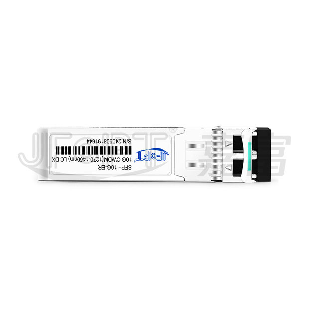 The JFOPT SFP+ 10G CWDM (1270-1450nm) ER LC DX series optical transceiver is designed for high-performance fiber communication applications, such as 10G Ethernet (10GBASE-ZR/ZW), and is fully compliant with the SFP+ MSA SFF-8431 specification. This module is optimized for single-mode fiber and operates across CWDM wavelengths, with ten available center wavelengths ranging from 1270nm to 1450nm, spaced 20nm apart. It offers a guaranteed optical link budget of 23dB. The module features an SFP+ connector for hot-plug capability and requires only a single 3.3V power supply. The optical output can be disabled via an LVTTL logic high-level input (TX_DIS), and a Loss of Signal (RX_LOS) output is provided to indicate the absence of an optical signal at the receiver.