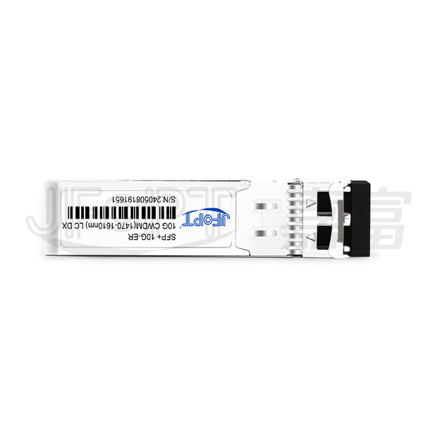 The JFOPT SFP+ 10G CWDM (1470-1610nm) ER LC DX series optical transceiver is designed for high-performance fiber communication applications up to 10G, fully compliant with the SFP+ MSA SFF-8431 specification. Optimized for single-mode fiber, this module operates across CWDM wavelengths, offering eight center wavelengths from 1470nm to 1610nm, with 20nm spacing between each wavelength. It provides a guaranteed optical link budget of 14dB. Featuring an SFP+ connector, the module supports hot-plug capability and requires only a single 3.3V power supply. The optical output can be disabled via an LVTTL logic high-level input (TX_DIS), and a Loss of Signal (RX_LOS) output is provided to indicate the loss of the input optical signal at the receiver. Additionally, this module offers digital diagnostic functions via a 2-wire serial interface, as defined by the SFF-8472 specification.