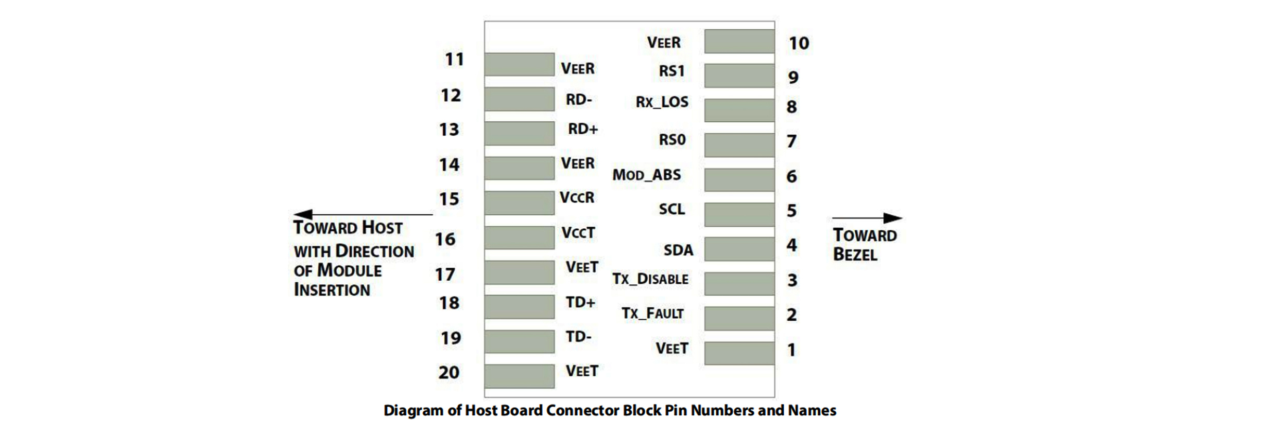 | Notes: 1.The module ground pins shall be isolated from the module case. 2.This pin is an open collector/drain output pin and shall be pulled up with 4.7K-10Kohms to Host_Vcc on the host board. 3.This pin shall be pulled up with 4.7K-10Kohms to VccT in the module. 4.This pin is an open collector/drain output pin and shall be pulled up with 4.7K-10Kohms to Host_Vcc on the host board. |