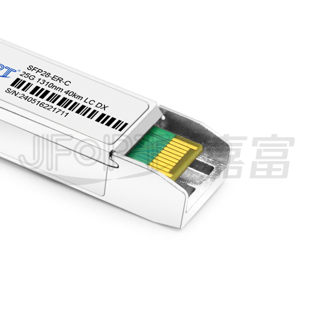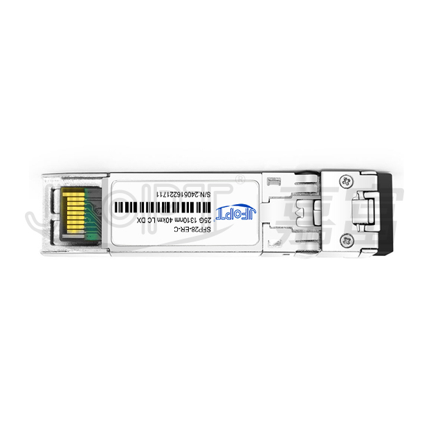 The JFOPT SFP28 25G 1310nm 40km ER LC DX is an ultra-compact optical transceiver module designed to convert 25Gbps serial CML electrical data into optical signals in compliance with the 25GBASE-ER standard. Its electrical interface adheres to SFI specifications, while the EML transmitter and APD receiver deliver exceptional performance for Ethernet applications, supporting links of up to 40km over single-mode fiber (SMF).This SFP28 ER module is fully compliant with SFF-8431, SFF-8432, and IEEE 802.3CC 25GBASE-ER standards. It also supports digital diagnostic functions via a 2-wire serial interface, as outlined in SFF-8472.With a fully SFP-compliant form factor, the module offers hot-pluggability, seamless optical port upgrades, and low EMI emissions, making it a reliable and efficient solution for high-speed networking.