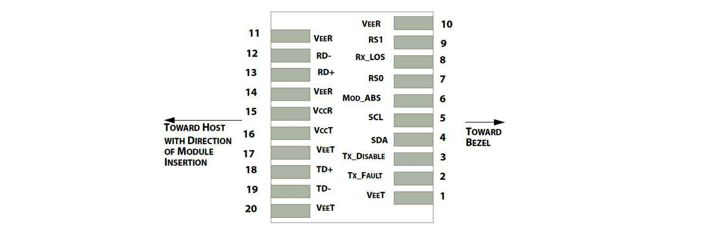 | Notes: 1.The module ground pins shall be isolated from the module case. 2.This pin is an open collector/drain output pin and shall be pulled up with 4.7K-10Kohms to Host_Vcc on the host board. 3.This pin shall be pulled up with 4.7K-10Kohms to VccT in the module. 4.This pin is an open collector/drain output pin and shall be pulled up with 4.7K-10Kohms to Host_Vcc on the host board. |
