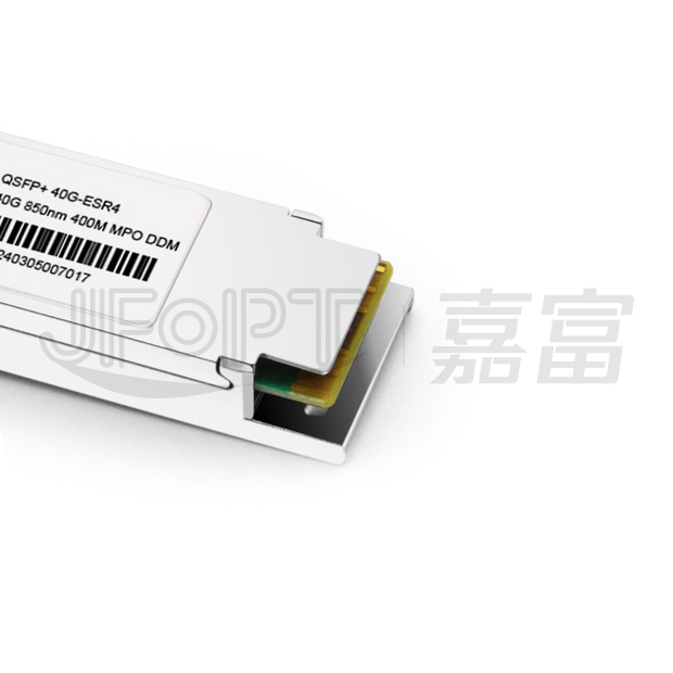 The JFOPT QSFP+ 40G 850nm 400m ESR4 MPO 8/12 transceiver is designed for 40GBASE Ethernet applications, supporting transmission up to 400m over multimode fiber (MMF) at an 850nm wavelength through an MTP/MPO-12 connector. It complies with QSFP+ MSA, IEEE 802.3ba 40GBASE-SR4, and IEEE 802.3ae 10GBASE-SR standards. Equipped with digital diagnostics accessible via the I2C interface, it provides real-time monitoring of operating parameters. With its hot-swappable and easy-to-install design, this transceiver is ideal for data centers, high-performance computing networks, and enterprise core and distribution layers.