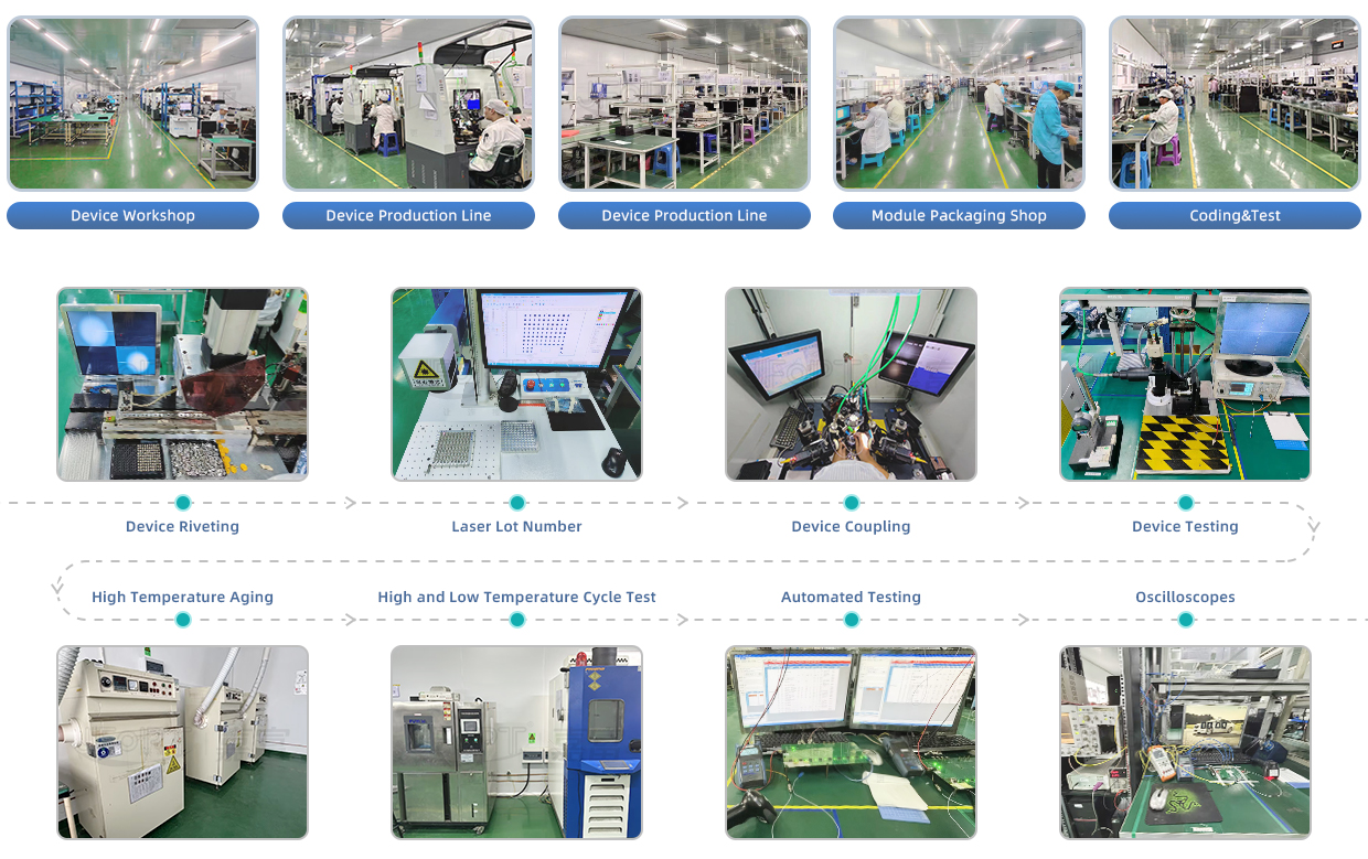 JFOPT continues to invest in optical transceiver production, covering a full range of optical transceiver such as 1*9, SFP, 10G, 25G, 100G, 200G, 400G, 800G GPON/EPON/XG/XGSPON OLT transceiver. At the same time, our company provides TOSA, ROSA, BOSA semi-finished device solutions for the downstream peer. JFOPT's production line has a daily production capacity of 10,000 optical transceivers and 20,000 optical devices. In addition, JFOPT's optical transceiver have industry-leading high temperature resistance and anti-interference capability, and are widely used in computing centers, operators, traffic security, power facilities and other industries.