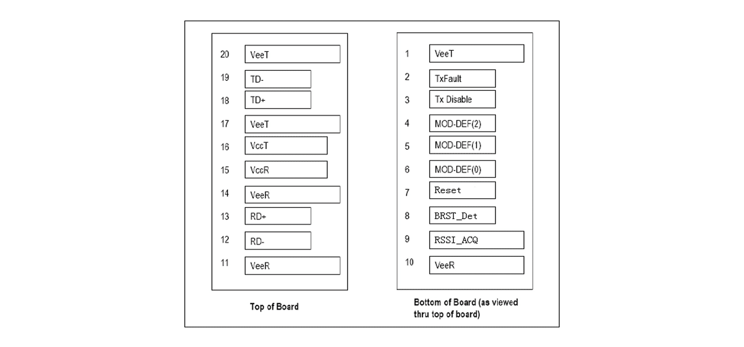| Notes: 1. TX Fault is an open collector output, which should be pulled up with a 4.7K~10KΩ resistor on the host board to a voltage between 2.0V and Vcc+0.3V. Logic 0 indicates normal operation; logic 1 indicates a laser fault of some kind. In the low state, the output will be pulled to less than 0.8V. 2. TX Disable is an input that is used to shut down the transmitter optical output. It is pulled up within the module with a 4.7K~10KΩ resistor. Its states are: Low (0~0.8V): Transmitter on (>0.8V, <2.0V): Undefined High (2.0~3.465V): Transmitter Disabled Open:Transmitter Disabled. 3. MOD-DEF 0,1,2 are the module definition pins. They should be pulled up with a 4.7K~10KΩ resistor on the host board. The pull-up voltage shall be VccT or VccR. MOD-DEF 0 is grounded by the module to indicate that the module is present. MOD-DEF 1 isthe clock line of two wire serial interface for serial ID. MOD-DEF 2 isthe data line of two wire serial interface for serial ID. 4. LOS is an open collector output, which should be pulled up with a 4.7K~10KΩ resistor on the host board to a voltage between 2.0V and Vcc+0.3V. Logic 0 indicates normal operation; logic 1 indicates loss of signal. In the low state, the output will be pulled to less than 0.8V. 5. These are the differential receiver outputs. They are AC coupled 100Ω differential lines which should be terminated with 100Ω (differential) atthe user SERDES. 6. These are the differential transmitter inputs. They are AC-coupled, differential lines with 100Ω differential termination inside the module. |